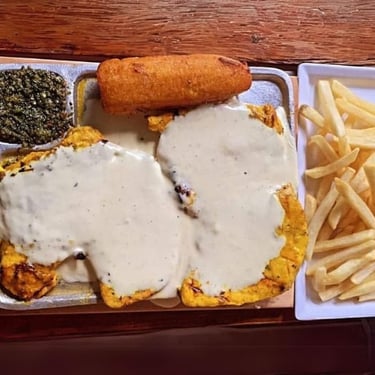Una mezcla perfecta de sabores: carne de res y pollo a la plancha, salchicha suiza, papas fritas crujientes, lechuga fresca, tomate, cebolla grille caramelizada y huevos de codorniz, queso gratinado y salsal al gusto. Es el plato perfecto para disfrutar con amigos y familiares.
