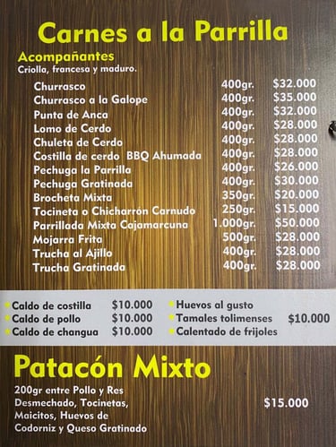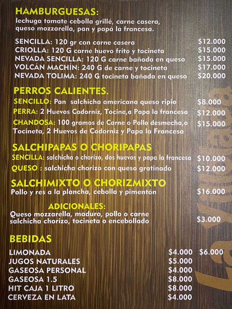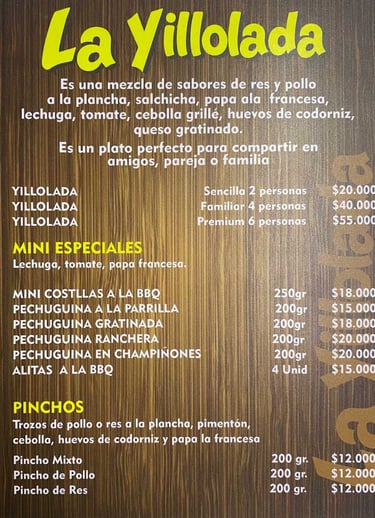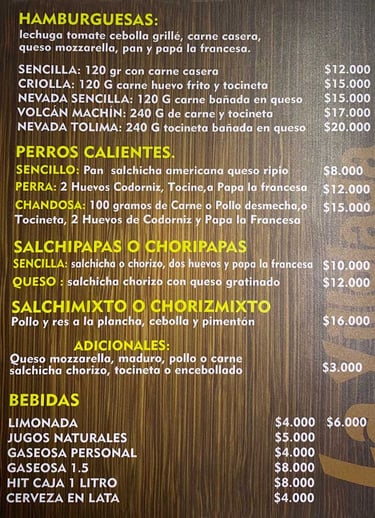 Contamos con: Variedad de Hamburguesas con carne de res,Salchipapas , Perros Calientes, Pinchos, Yilloladas, Pechugas, Patacón mixto, Carnes a la Parrilla y una gran variedad de bebidas