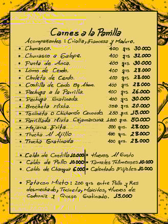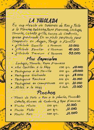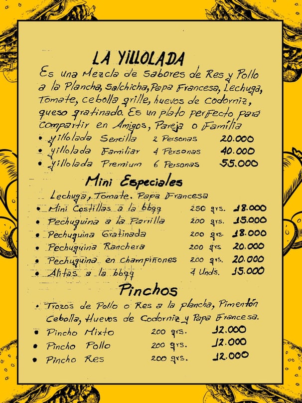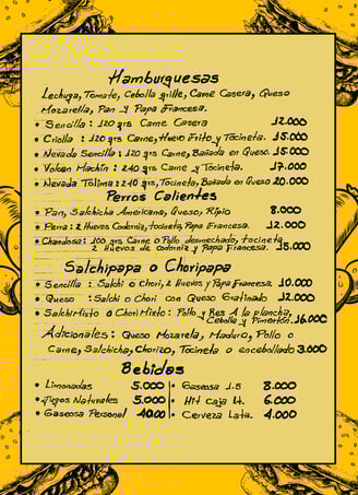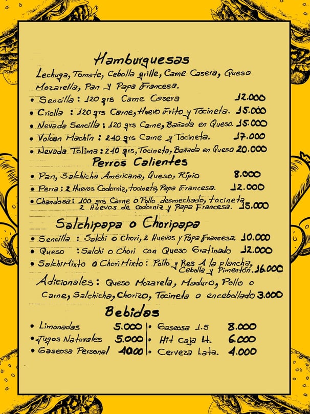 Contamos con: Variedad de Hamburguesas con carne de res,Salchipapas , Perros Calientes, Pinchos, Yilloladas, Pechugas, Patacón mixto, Carnes a la Parrilla y una gran variedad de bebidas